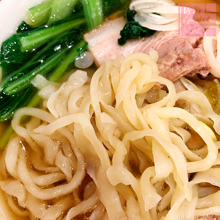 麺は平打ち麺で、太さはまちまち。平打ちでも薄いほうだが、コシがありシコよりプリに近い。