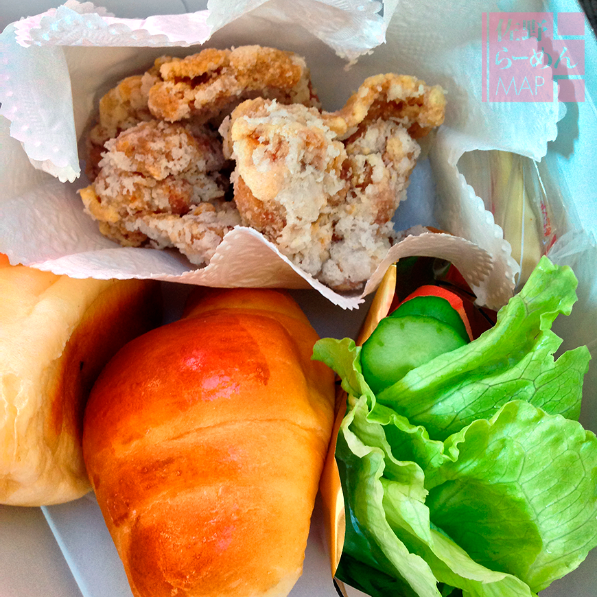 ロゴ入り箱の中に、サラダ・バターロール・チキン・バター・マヨネーズ等々が詰まっていて、